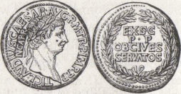 COIN OF CLAUDIUS The peace initiative collapsed and hostilities were resumed between the British and the Romans. Commander Auus Plautius was recalled to Rome in A.D. 47 and honourable relieved of his command. Apparently, the Emperor distrusted leaving the husband of a member of the British royal family in charge of operating the war. In Rome, Gladys, the wife of Plautius, was subjected to a novel trial brought a-bout by her Christian faith. (Tradition has that Gladys had been personally converted by Joseph of Arimathea at Avalon) By right of Roman law, nobility could judge a legal dispute where the family was concerned. Consequently, it was in order for Plautius to judge his wife. Since theirs was a love marriage, free of all political significance on either side and Plautius knew his wife was a Christian before he married her, the verdict of innocence was not unexpected. The trial of Gladys is well covered by Tacitus (Roman historian A.D. 55-120) as noted from his record. "Pomponia Graecina, a woman of illustrious birth, and the wife of Plautius, who, on his return from Britain, entered the city with the pomp of an ovation, was accused of embracing the rites of a foreign superstition. The matter was referred to the jurisdiction of her husband Plautius, in conformity to ancient usage, called together a number of her relations, and in her presence, sat in judgment on the conduct of his wife. He pronounced her innocent." Caractacus and Arviragus along with his wife, Venus Julia, returned to Britain. They left Gladys, sister of Caractacus, with Plautius in Rome. All were faced with an unpleasant situation; Plautius in conducting the war against his in-laws, Caractacus against his sister and brother-in-law, with Arviragus opposing his father-in-law, the Emperor Claudius. For sheer drama and stirring romance this situation has no equal in the pages of history. Plautius was replaced by Ostorius Scapula and the war continued for seven years. Finally, after many bloody battles, the British under Caractacus, met disaster at Clune, Shropshire in A.D. 52. It took the combined forces of four great Roman generals together with the Emperor Claudius and a new army from Rome that vastly outnumbered the British to bring about their defeat. This, in itself, is the greatest tribute that could be given to the military excellence of Caractacus, the valorous British general. However, Caractacus himself could have escaped to carry on the conflict had he not been betrayed by one of his Icene countrymen into the hands of his enemies. Later, Arviragus avenged the treachery by warring through the domain of the betrayer and taking terrible vengeance. As the result of his betrayal, Caractacus was taken hostage to Rome. Among the captives were his wife, his three sons, two daughters, his father Bran, the Blessed, and a brother who remained on the field of battle to receive the terms of the victors. Tacitus, in his Annals (Bk. XII, Chap. 36), records the jubilation of the Roman people at the arrival of the famed British warrior. Even in chains, the people feared and yet respected this "barbarous Christian" British leader. Roman conquerors were never noted for their clemency. They delighted in humiliating their adversaries in the most savage forms of torture. The greater the renown of their unfortunate victims, the less chance they had of escaping the horrors of the Tartpeian dungeons. Caractacus was tried before the Roman Senate. Although it was against the Roman law for a woman to enter the Senate, Tacitus tells us that the younger daughter of Caractacus (named "Gladys" after her aunt) refused to be separated from her father. She remained by his side throughout the trial. Standing calmly, defiant, unconquered in spirit, the Briton faced the Emperor Claudius and the great Queen Agrippira. Speaking in a clear voice, vibrant with the courageous conviction of a free man, the captive replied to his prosecutors with words that will be remembered by free man the world over. From the Annals of Tacitus we learn how Caractacus addressed the Senate. "Had my government in Britain been directed solely with a view to the preservation of my hereditary domains, or the aggrandizement of my own family, I might long since have entered this city an ally, not a prisoner: nor would you have disdained for a friend a king descended from illustrious ancestors, and the dictator of many nations. My present condition, stripped of its former majesty, is as adverse to myself as it is cause of triumph to you. What then? I was lord of men, arms, wealth; what wonder if at your dictation I refused to resign them? Does it follow, that because the Romans aspire to universal domination, every nation is to accept the vassalage they would impose? I am now in your power betrayed, not conquered. Had I like others, yielded without resistance, where would have been the name of Caradec? Where your glory? Oblivion would have buried both in the same tomb. Bid me live. I shall survive for ever in history one example at least of Roman clemency." By the order of the Claudian Tribunal, Caractacus (with all the members of the royal Silurian family) was immediately set free. Only one restriction was imposed on the pardon of the British king. He must remain in Rome, on parole, for seven years. Neither he, nor any member of his family, were ever to bear arms against Rome. Caractacus agreed to this and never thereafter did he break his pledge, even after his return to Britain while the war continued between Briton and Roman. One son, Cyllinus, was permitted to return to Britain and rule over the kingdom of the Welsh Silurians in the place of his father. Again, we have a strange situation that has puzzled students of Roman history for years. Why did the Emperor Claudius render his remarkable verdict? Why had the Romans not demanded the customary Roman revenge? The pages of history are full of Roman "triumphs;" thrown to the starving lions in the arena; torn apart on the r