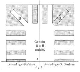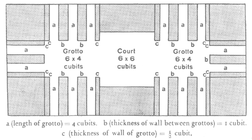 - A space of one cubit was allowed for each of the walls intervening between the sepulchral chambers, and half a cubit space was left at the end of each wall. The two longer walls of the grotto, being respectively six cubits in length, could, therefore, contain three chambers each: The chambers, each of one cubit in width, occupying three cubits; the two walls between them, two cubits; and the two half cubit spaces at the corners, another cubit. The shorter wall facing the entrance, being four cubits long, could contain two chambers only: the chambers occupying two cubits; the intervening wall, one cubit; and the two half cubit spaces at the corners, another cubit.