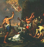 — Rabbi Dr. Freedman (29) Those words ("stoning … was the means of bringing about the actual death"), coming from the pen of Talmud scholar and translator, Rabbi Freedman, Ph.D., seem to carry more weight than a statement by a Washington lawyer and a retired Israeli judge. Could Elon, Lewin, et al. be attempting to make Talmud doctrine more acceptable to other death penalty reformers who might read the brief? — Stoned After Push From ScaffoldA scaffold was sometimes used in stoning. GEMARA. … The scaffold [for stoning] was of the height of two men's statures. And it has been taught regarding this: When you add the stature of the convict there will be there the height of three statures. Now, if you assume that a fall can be fatal even from a height of less than ten handbreadths, why was such a great height as that necessary? — But even according to your argument, why not make the height ten handbreadths only? This must therefore be explained in accordance with R. Nahman, for R. Nahman stated that Rabbah b. Abbuha had said: Scripture says, And thou shalt love thy neighbour as thyself, [which implies], 'thou shalt choose for a convict the easiest possible execution.' But if so, why not raise it still higher? — He would then become disfigured altogether. — Babylonian Talmud, Tractate Baba Kamma 51a Baba Kamma 51a portrays the condemned man falling from the scaffold a distance of "two men's statures," and a footnote refers us to Sanhedrin 45a, with its explanatory footnote. The condemned would land on the ground where the stoners are standing. If he landed prostrate, stones would descend upon him from a height of three or four feet, depending on the height of the stoners. If he landed on his feet, he would be stoned in the same fashion as the betrothed damsel who played the harlot — stoned standing, by standing stoners. Note: Expressing humanitarian concerns about disfigurement, the rabbis prescribe a fall from a height they believe would not always kill. Falling from a great height would kill instantly; had the rabbis wanted the quickest and least painful death, the scaffold would be raised as high as possible. At this point we must begin to suspect Lewin and his colleagues did not expect us to read the Talmud ourselves. But as responsible Americans, curious about Judaism and concerned about capital punishment, that's exactly what we're doing. — New Testament Reportage Of StoningsBefore we leave our discussion of stoning, we should point out that the stoning described in Tractate Kethuboth 44b-45a (betrothed damsel who played the harlot) is more in accord with the stoning Christians have always understood from the New Testament. Read about the stoning of St. Stephen, Acts, Chapter 7, particularly 7:57-60. The narrative depicts just such a stoning as Christian painters have depicted for centuries — level ground, no pushing, no scaffolds or pits with stone floors: the victim apparently died from no cause other than "the force of the objects thrown at him," despite the Elon/Lewin representation to the Supreme Court. The New Testament also contains the famous incident described by John in 8:7, wherein a woman, arrested in the act adultery, is brought to Jesus. Jesus challenges the Pharisees: "He that is without sin among you, let him first cast a stone at her." (KJV) There is no mention of a pit, nor a stone floor, nor did Jesus challenge anyone to "push" the woman. John 8:59 and John 10:22-39 give accounts of attempts by the Pharisees to stone Jesus. There is no mention of a pit or a scaffold.
