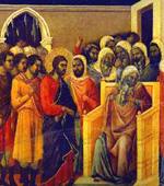 When an adulteress is arrested in the act and brought to Jesus, the scribes and Pharisees challenge Jesus on Mosaic law, pointing out that she should be stoned. Rather than agreeing, Jesus intimidates the Pharisees into abandoning the project, and tells the woman, "Go and sin no more."