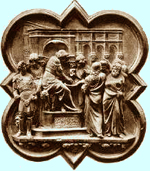 Pilate Washing His Hands, Lorenzo Ghiberti, 1403-24, carving on door, Baptistry, Florence