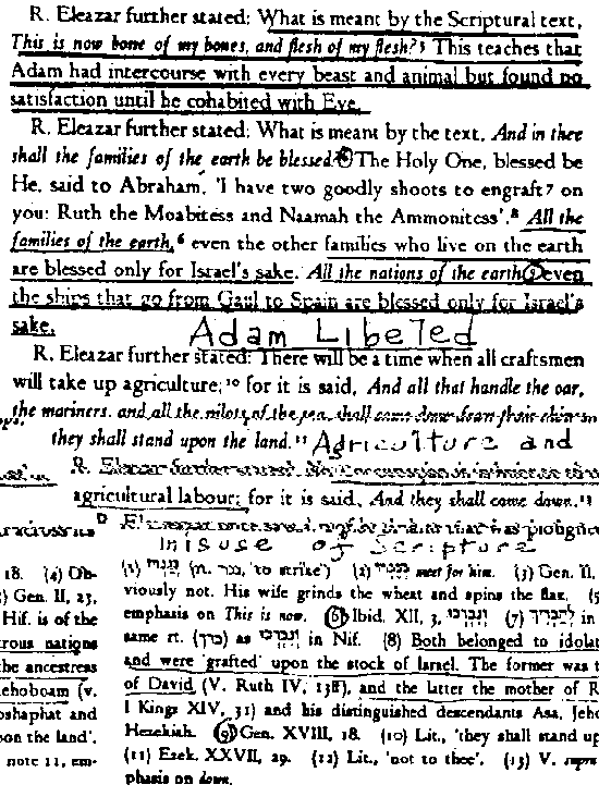 But the Talmud changes this beautiful account to say That: ". . . This is now bone of my bones and flesh of my flesh? This teaches that Adam had intercourse with every beast and animal but found no satisfaction until he cohabited with Eve." (See following exhibit.)