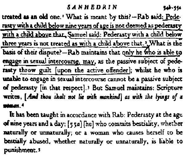 An idea of the asinine language found in the Yebamoth volume can be seen by the following. A little girl is determined to be an adolescent (one who has not borne a child) if she has only two pubic hairs on her private parts. This is too stupid to credit to anything but a sewer mentality. Yet dealing in unnatural filth is at the core of Talmudic teaching. No wonder the Apostle Paul said that they changed the truth of God into a lie. (Romans 1:25 - 28)