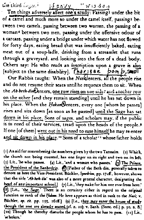 When Jesus called the Pharisees "blind and fools," He knew whereof He spoke since in The Talmud they argue over whether "dipping one or two fingers in salt makes one wise; whether passing under the bit of a camel, or the camel itself, interferes with one's mentality; and how many rows of students must stand up when the head of the Talmudic school, called the "nasi" enters the room." (See following exhibit.)