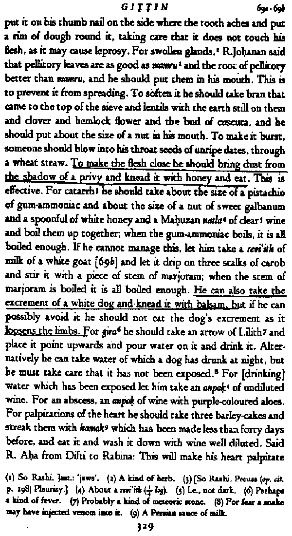 There are some very amusing things found in the stupidity of Talmudic remedies, such as found in the Gittin volume with its mixtures of dung, blood and filth. It is not so much the stupidity of the remedies themselves, but the commentary by a goy English doctor (which appears in the Soncino English translation) as he attempts to justify and praise the medical wisdom of the Pharisees.