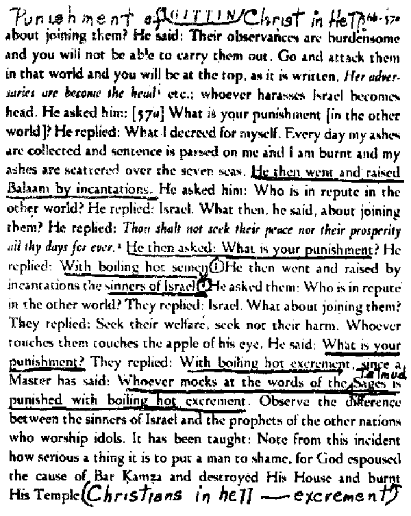 According to volume Gittin 56b-57a, "All who mock the words of the sages (this means all Christians who believe the Christian Bible) will be punished for eternity in boiling hot excrement." (See exhibit)