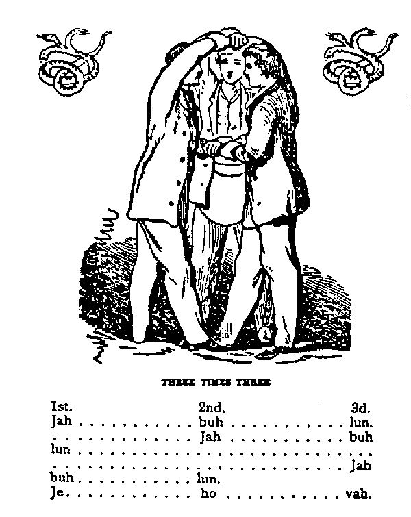 The secret ritual of the craft prints the letters J.B.O. It states: "We three do meet and agree-in peace, love and unity-the Sacred Word to keep-and never to divulge the same-until we three, or three such as we, do meet and agree." Thus, no Royal Arch Mason can pronounce the whole sacred name by himself!