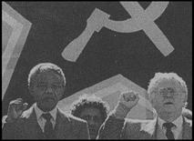 Nelson Mandela and Joe Slovo give the clenched fist salute in front of the blood‑drenched Hammer and Sickle flag of Jewish Bolshevism. Slovo, a Yiddish‑speaking Lithuanian Jew, was Secretary General of the South African Communist Party and director of the military wing of the ANC, which perpetrated numerous terror bombings against white civilians. Mandela was hailed as a great statesman by Britain's Queen Elizabeth II in her 1996 Christmas message to the realm.