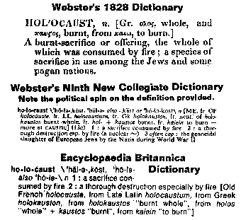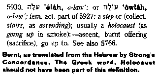 Holocaust is a strange word used by both Christians and Jews describing what they characterize as "Germany's final solution to the Jewish Question." Yet, holocaust has neither a Hebrew, Yiddish, German or English origin. It is a word that has a Greek origin, meaning, "to be burnt whole." How that Greek word managed to get into the Hebrew translation of the Catholic Bible, I can only speculate, and we will discuss that in a later lesson. What is important for this lesson is that any holocaust is a "burnt offering to a
