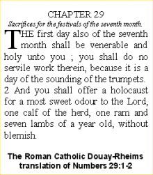 One day during our study together, the matter of the German Holocaust came up and I asked him if that word was Hebrew or Yiddish. He told me that it was a perfectly good Bible word. I challenged him, stating that the word holocaust was not to be found anywhere in the Bible. I confirmed that truth by double-checking in my Strong's Exhaustive Concordance. Where upon he opened his Douay-Rheims to a dozen Scriptures containing the word holocaust. One of these is found in Numbers 29:1-2: